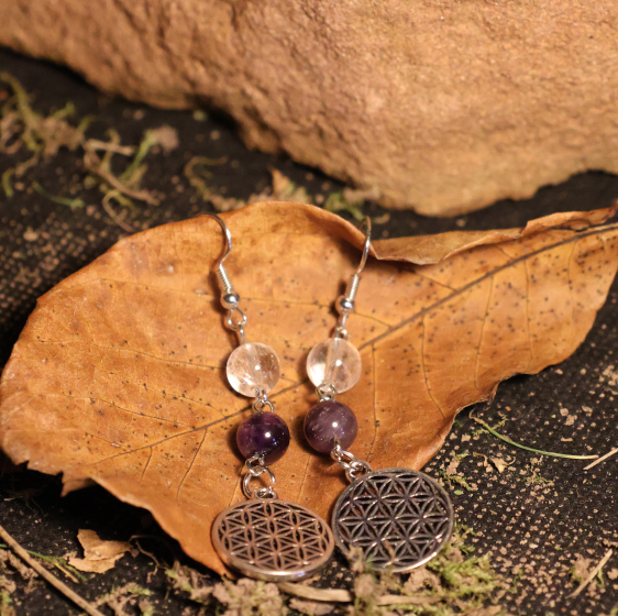 Wunderschöne Ohrringe/Ohrhänger mit Amethyst und Bergkristall und der Blume des Lebens.